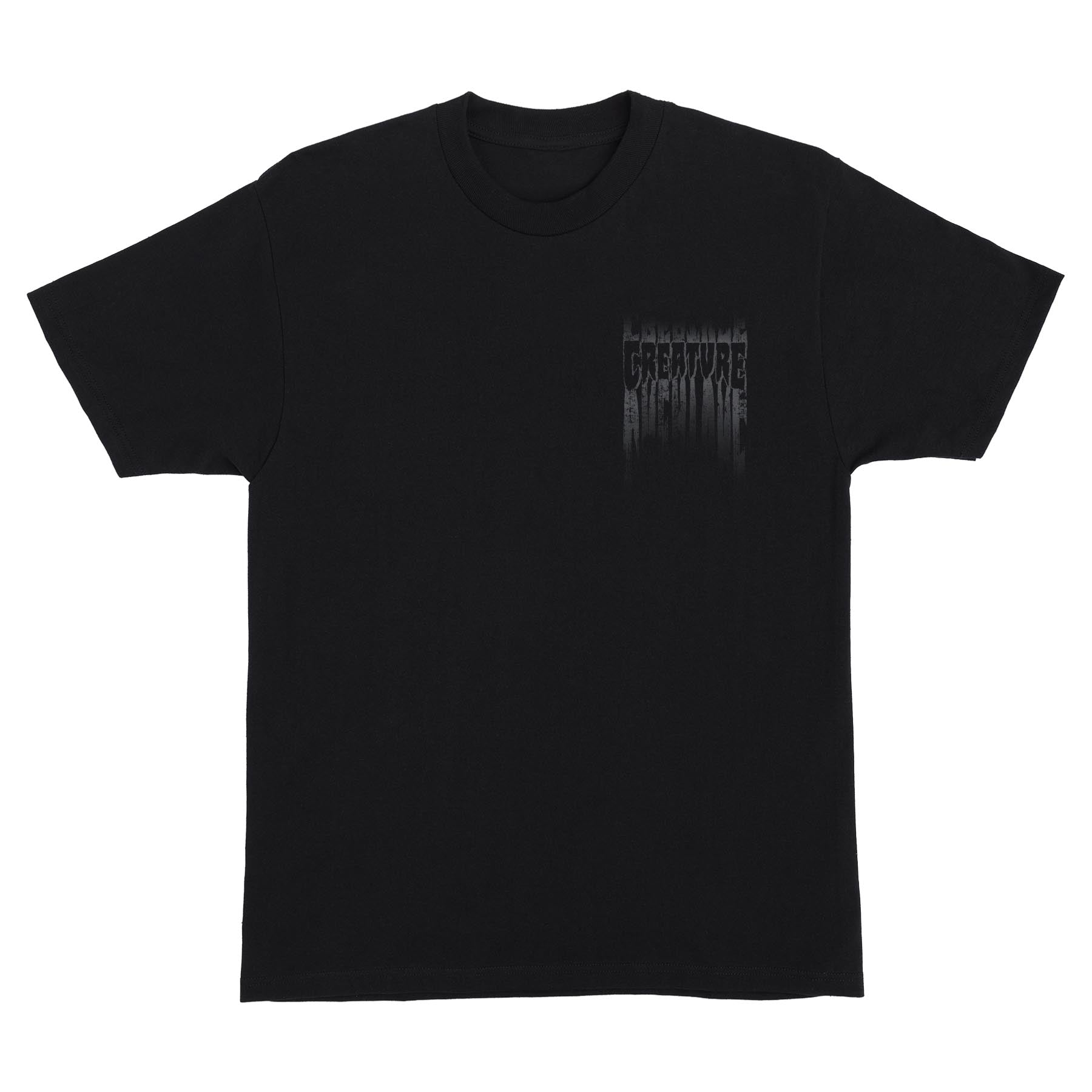 The Creature Tattered men's regular fit short-sleeve t-shirt features medium front and large back Creature Tattered artwork printed in soft hand ink.